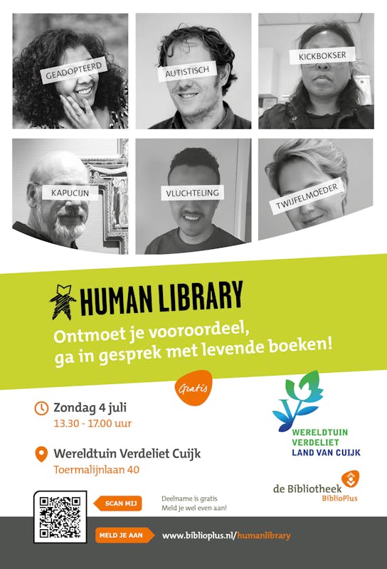 Komende zondag, 4 juli, wordt het echt een mooie dag om met een boek in de tuin te zitten. Maar, het kan nóg beter. Je kunt ook met een levend boek in Wereldtuin Verdeliet afspreken! De levende boeken komen bijna allemaal uit Land van Cuijk of Maasduinen. Stap onbevangen in de belevingswereld van een ander en ga op blind date met een levend boek! Wat je gaat horen, dat weet je niet. Wel ben je verzekerd van een goed gesprek dat je leven zal verrijken.