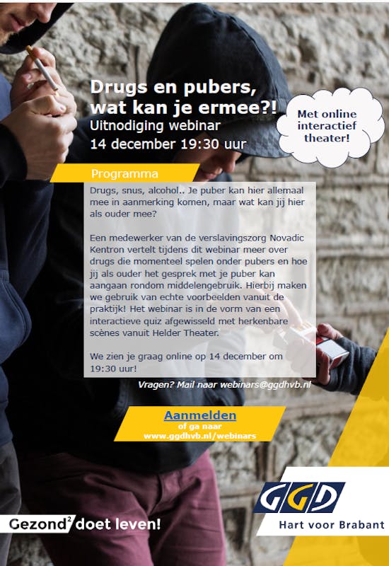 Een medewerker van de verslavingszorg Novadic Kentron vertelt tijdens dit webinar meer over drugs die momenteel spelen onder pubers en hoe jij als ouder het gesprek met je puber kan aangaan rondom middelengebruik. Hierbij maken we gebruik van echte voorbeelden vanuit de praktijk! Het webinar is in de vorm van een interactieve quiz afgewisseld met herkenbare scènes vanuit Helder Theater.
