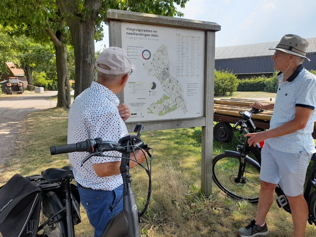 Al fietsend op een prima tempo over vooral verharde wegen geniet ik van de omgeving, we komen op paden waar ik nooit eerder was. Regelmatig geeft Jo uitleg over wat we zien. Ik vraag hem wie zijn ‘klanten’ meestal zijn. “Dat zijn vooral toeristen die in Overloon verblijven. Maar ook inwoners van Overloon en de regio vinden het leuk meer te horen over hun (buurt)dorp.” Regelmatig stappen we even de fiets af voor een verhaal van Jo. De Tweede Wereldoorlog komt hierin als een rode draad terug, dat is ook niet gek wanneer je hoort dat er destijds 2500 mensen zijn gesneuveld in amper twee weken tijd. Van Overloon was vrijwel niets over.